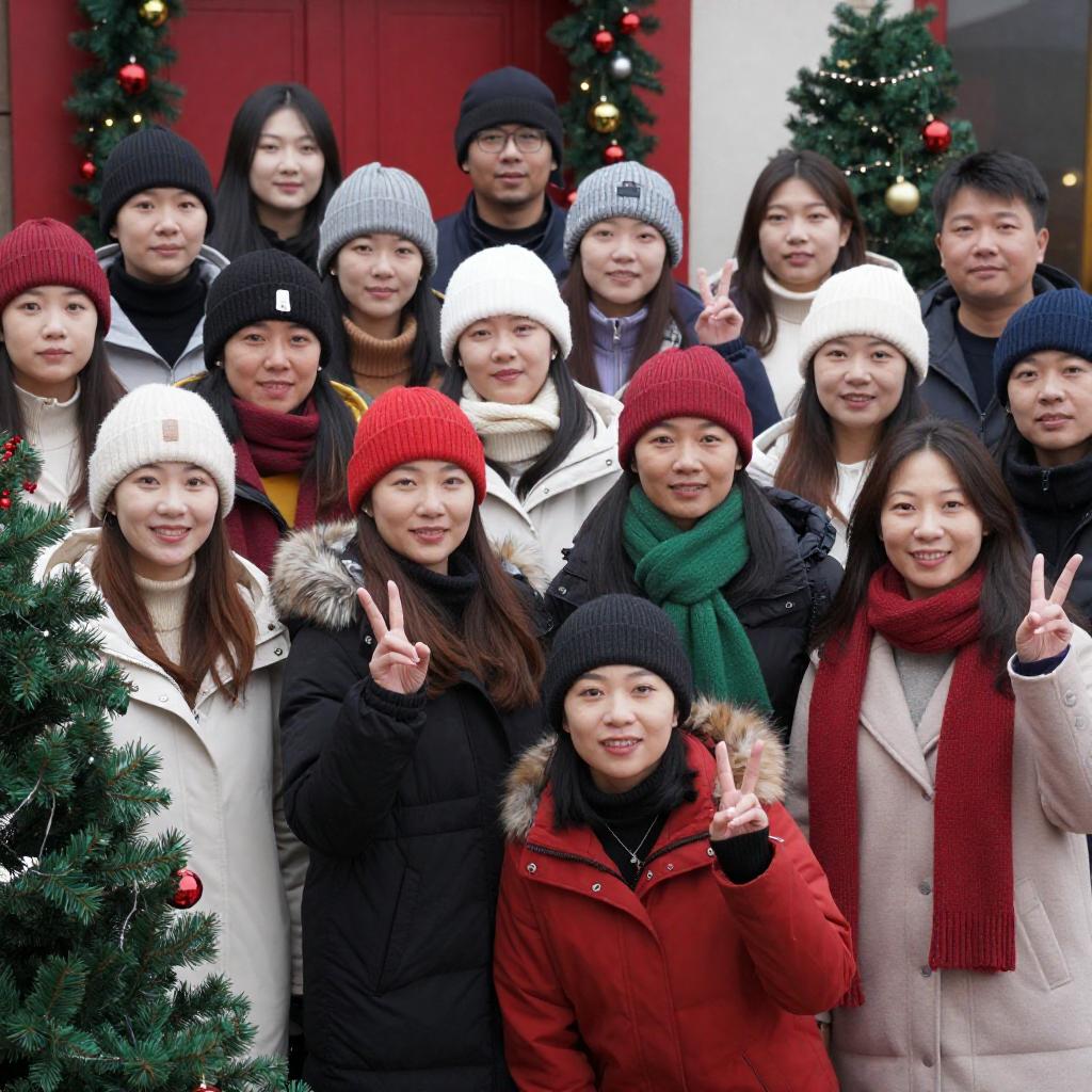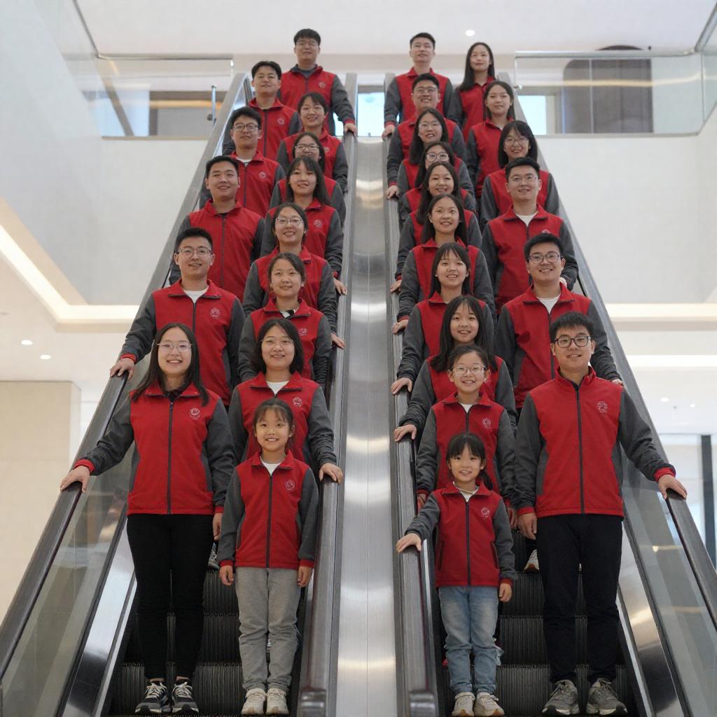 Photograph of a diverse group of 24 people, mostly young adults and children, standing on an escalator. They wear matching red and gray jackets, with some holding hands or hugging. The background is a brightly lit indoor space with glass walls. The escalator's shiny metal and glass create reflections. The group is smiling and appears cheerful.