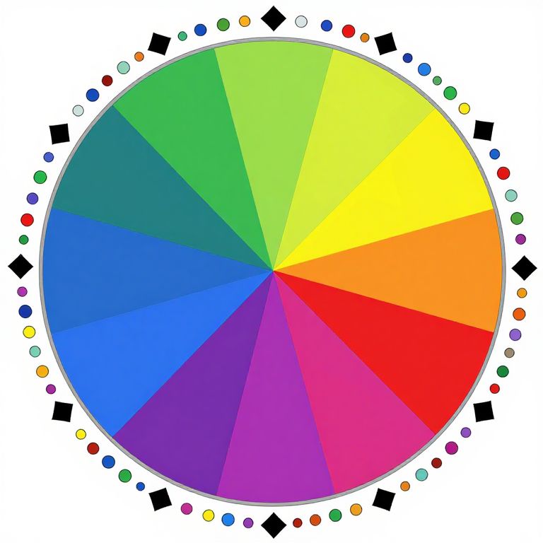 Circular mandala featuring a vibrant color wheel design, divided into twelve segments showcasing a spectrum of hues from red to violet, bordered by a decorative scalloped edge with colorful dots and black triangular accents.