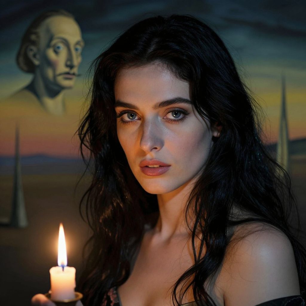 Craft a photorealistic portrait of a mysterious Mediterranean woman with serene blue eyes and flowing raven hair illuminated by candlelight's soft glow. Subtle shadows from flickering flames dance across her delicate features, accentuating her porcelain skin as she shares a secret with the viewer through a slight smirk. Set against an abstract backdrop inspired by Salvador Dali's surrealist works, this scene invites exploration into the captivating depths of her gaze and the untold stories within.