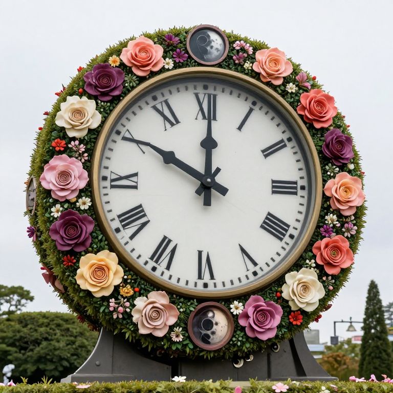 Clock faces bloom like flowers atop mechanical hedges, their ticking petals opening and closing with the rhythm of the moon’s phases.