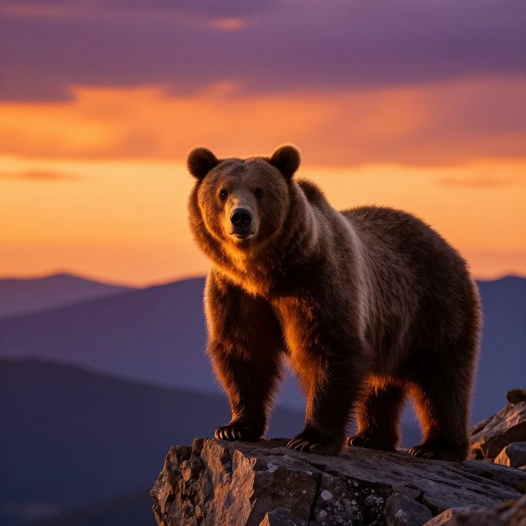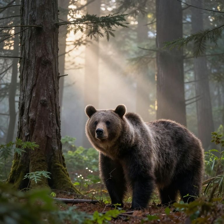 Bear in a dense, misty forest at dawn, soft rays of sunlight filtering through tall ancient trees, realistic fur texture, peaceful expression, intricate details of leaves and forest floor, high resolution, atmospheric depth