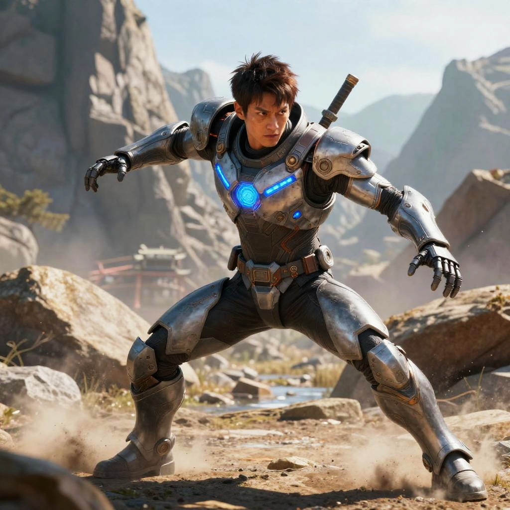 Anime with guy with white hair wearing a futuristic battle armor in a ruined cityscape, intense action pose with energy blasts surrounding him, high contrast lighting, detailed mechanical textures, dramatic and cinematic composition