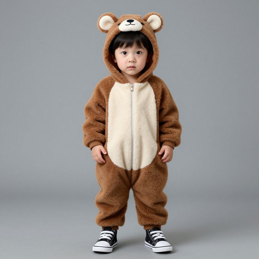 Photograph of an East Asian toddler standing against a plain gray background, wearing a brown and cream-colored fuzzy bear onesie. The onesie has a white face patch on the hood, bear ears on top, and a cream-colored belly. The child has straight black hair and is looking directly at the camera with a neutral expression. He is also wearing black and white sneakers. The texture of the onesie is soft and plush, contrasting with the smooth gray background. The child's small hands are relaxed by his sides.