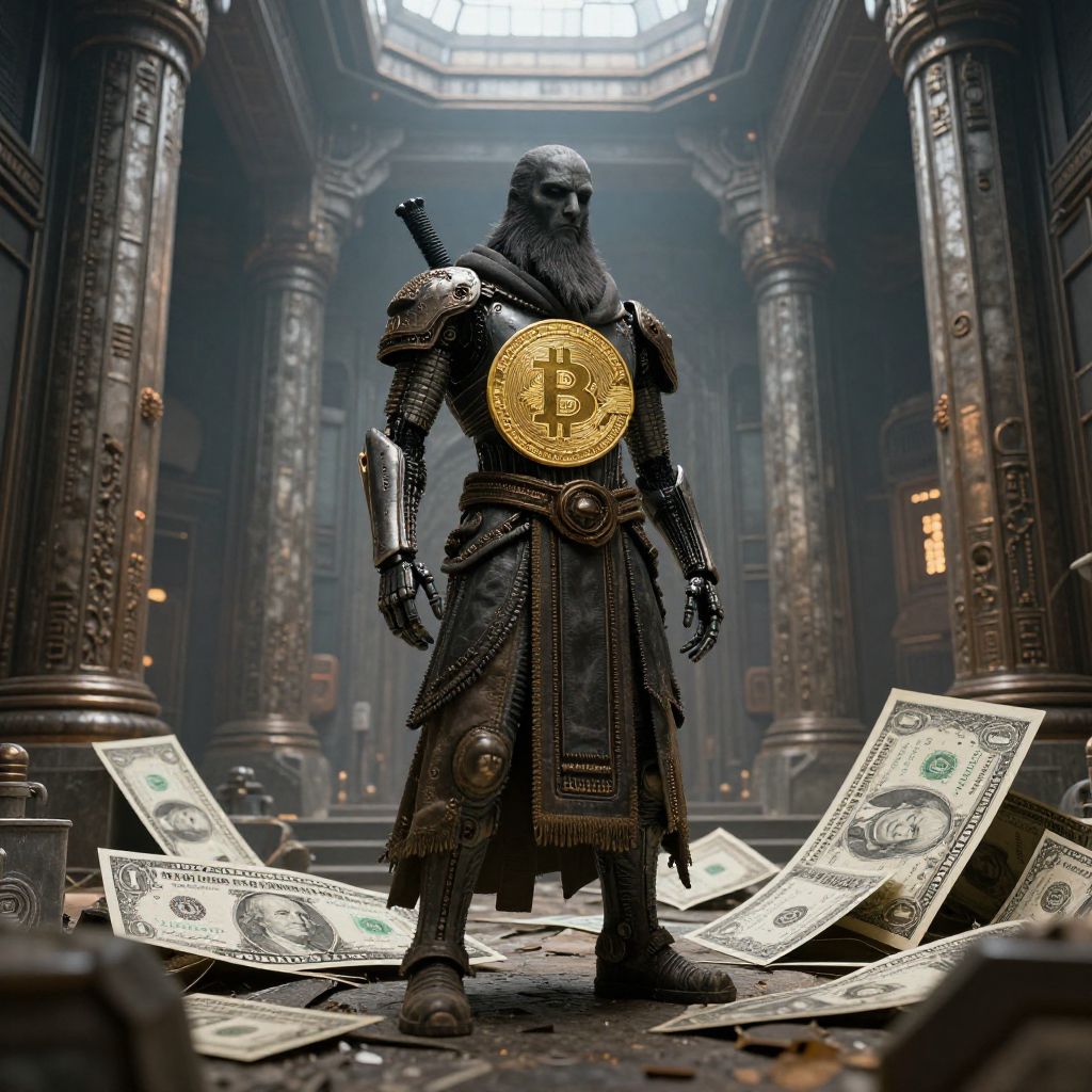 Photorealistic digital artwork depicts a towering, armored figure with a black beard and helmet, standing in a grand, dimly lit, columned hall. He wears a large, gold Bitcoin symbol on his chest and ornate, dark metal armor. Scattered around his feet are numerous U.S. dollar bills. The background includes ornate, metallic columns and a glowing skylight above. The figure's expression is stern, and the overall atmosphere is dark and imposing, blending elements of medieval armor with modern cryptocurrency themes.