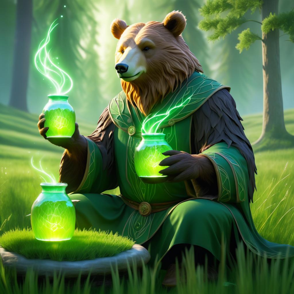 A detailed cinematic-style illustration of an anthropomorphic bear druid dressed in green robes, brewing a glowing green potion in a serene forest meadow. The scene features volumetric lighting highlighting the magical atmosphere and vibrant lush greenery with tall conifer trees in the background. The bear holds a vial emitting magical green light and leaves, evoking a fantasy Magic: The Gathering theme.