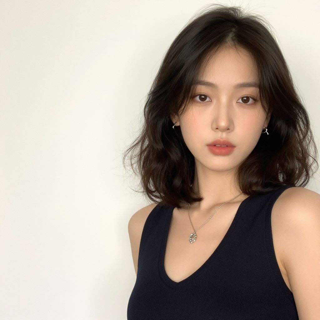 Photograph of an Asian woman with a light skin tone, shoulder-length, wavy, dark brown hair, and wearing large, round, metal-framed glasses. She has a slim build and is dressed in a black, ribbed, sleeveless tank top. She is accessorized with small, silver hoop earrings and a delicate, gold chain necklace. Her expression is neutral, with slightly parted lips. The background is a plain, white, seamless backdrop, highlighting her face and upper body. The lighting is bright and even, emphasizing her clear skin and soft features.