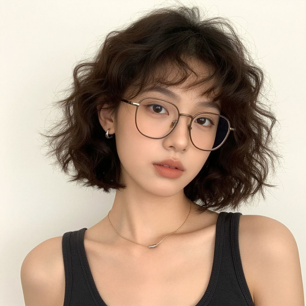 "short curly hairstyle, 1girl, solo, jewelry, glasses, earrings, realistic, necklace, lips, brown hair, looking at viewer, black hair, tank top Realistic photo of casual sexy person with pretty face"