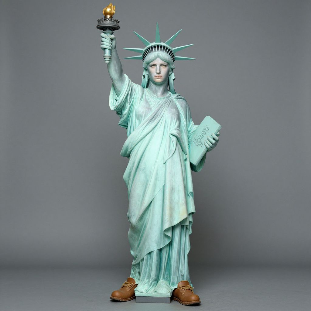 Photograph of a statue of Liberty with a torch raised, holding a tablet, wearing brown boots, against a gray background.