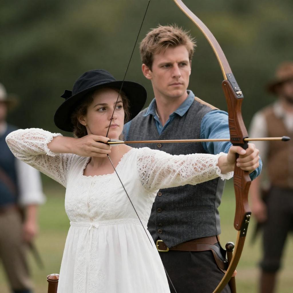 Photograph of a man and woman in period clothing, mid-archery shot. The woman, with a white lace dress and black hat, holds a wooden bow, while the man, in a blue shirt and gray vest, assists her from behind. Both have focused expressions. Background includes greenery and blurred figures.
