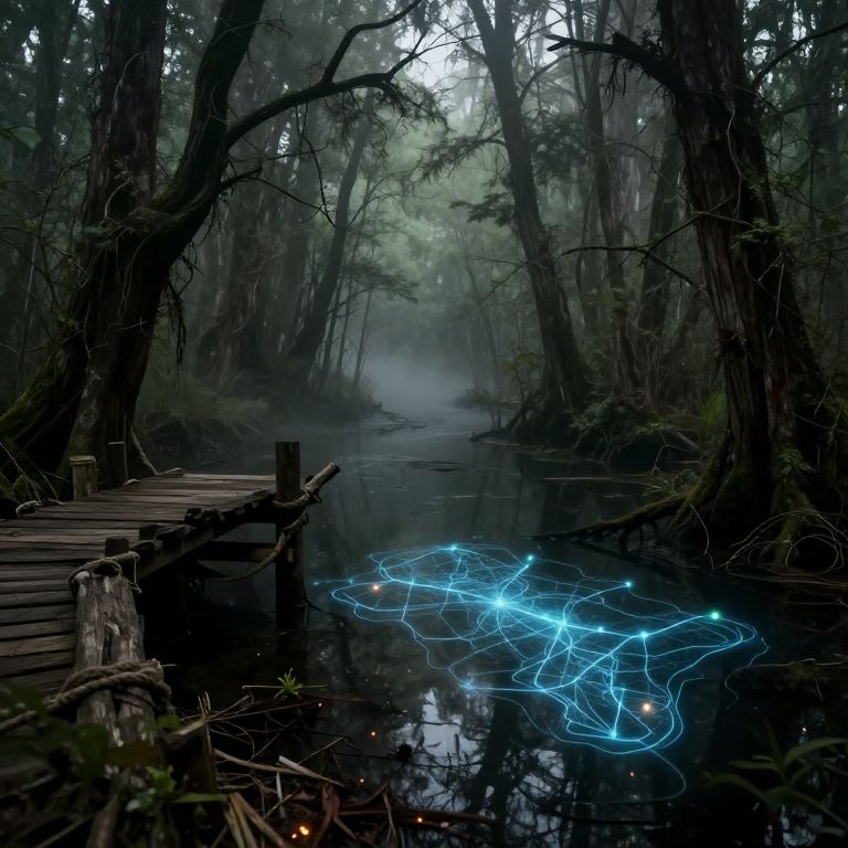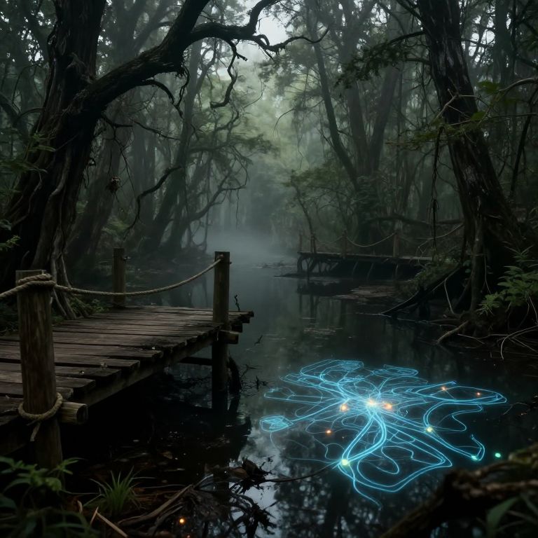 Dark and eerie swamp environment, dense twisted trees with gnarled branches reaching upward, faintly illuminated by a dull, diffuse light, A wooden, decayed platform with rope-bound wooden poles scattered among murky, shallow water, The ground is littered with decaying vegetation and debris, A glowing, ethereal blue map overlay with interconnected pathways, glowing orange and green markers, The atmosphere is moody, grim, and foreboding, with thick fog rolling through the swamp, blending with the muted, dark green and brown color palette, Subtle particle effects of sparks and glowing embers near the ground, Cinematic framing with a focus on the river, while the surrounding environment fades into shadow