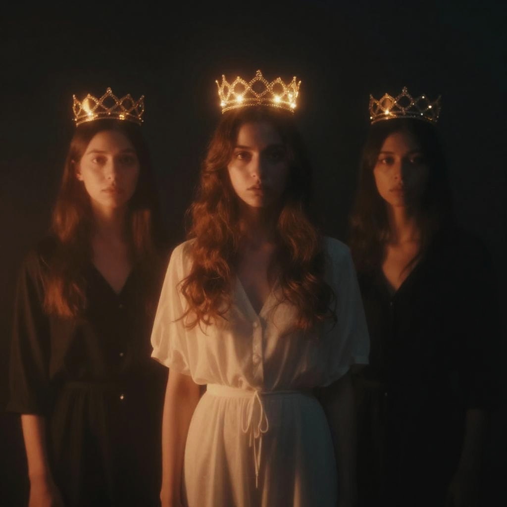 A surreal and ghostly scene of three blurred figures wearing glowing crowns, standing with blurred motion effects, dramatic orange and black lighting, moody atmosphere, mysterious and ethereal mood