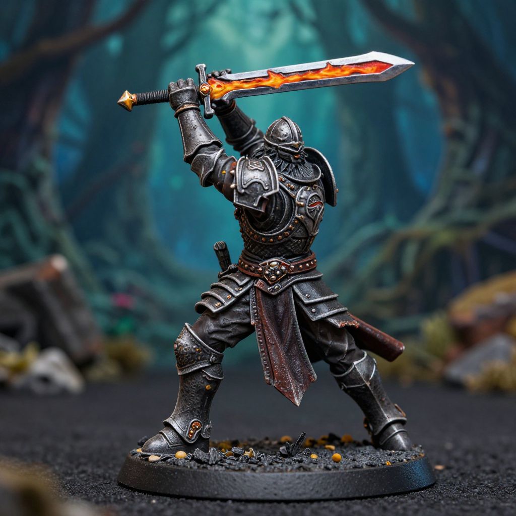 Dnd model creator assembling a warrior miniature with battle-scarred armor, wielding a flaming sword, set against a mystical forest background, emphasis on dynamic pose and detailed sculpting, fantasy miniature painting style