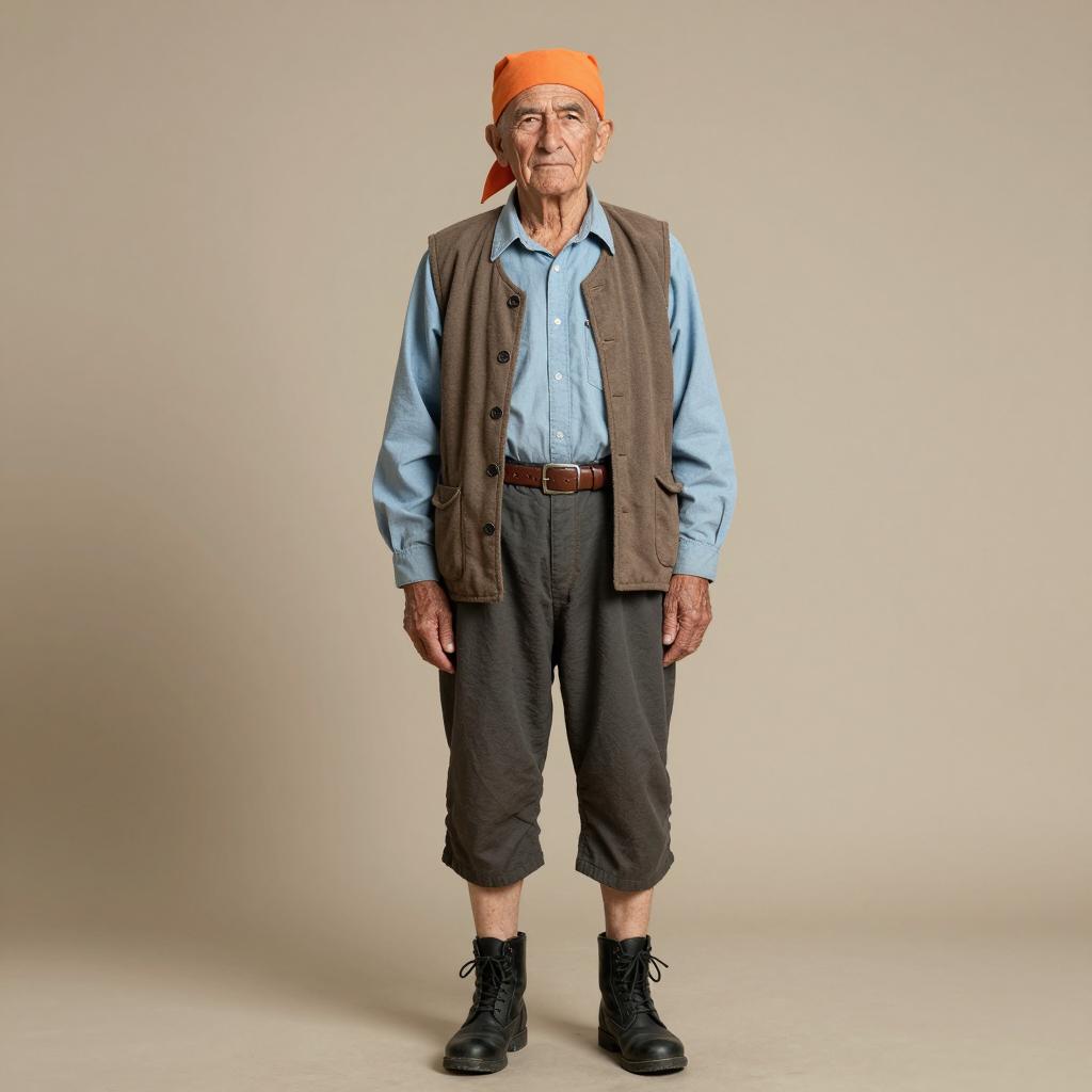 Full-body portrait of an elderly man standing against a beige background. He is wearing an orange headscarf, light blue long-sleeve shirt, brown vest, dark gray knee-length pants, a brown belt, and black lace-up boots. The image is well-lit with warm lighting and subtle shadows, highlighting realistic aging features and traditional clothing textures.