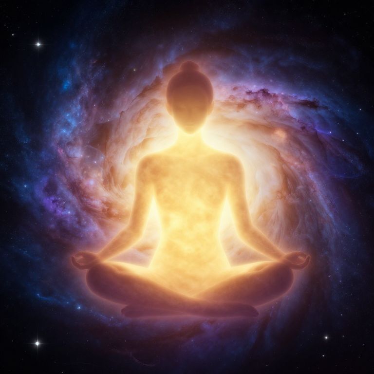 A pair of hands in mudra against cosmic background, stars and nebula swirling around, blending human spiritual energy with universe, vivid blues and purples color palette, fine detail in fingertips and gentle shadows