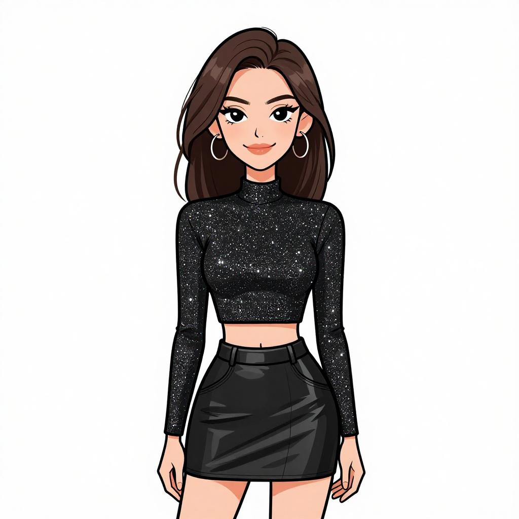Woman with pretty face and pretty hair. smiling Woman, edgy, black mock neck crop top, short sleeves, leopard print mini skirt, asymmetric wrap style, metallic gold arm cuff. --sref 1467