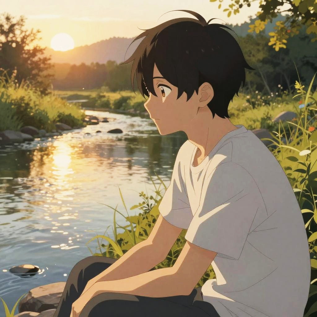 Black and white anime art showcasing a melancholic scene of a young boy sitting by a window in a rainy day, delicate shading highlighting raindrops on glass and soft folds of clothing, minimalistic but expressive facial features, ethereal atmosphere with blurred background elements.