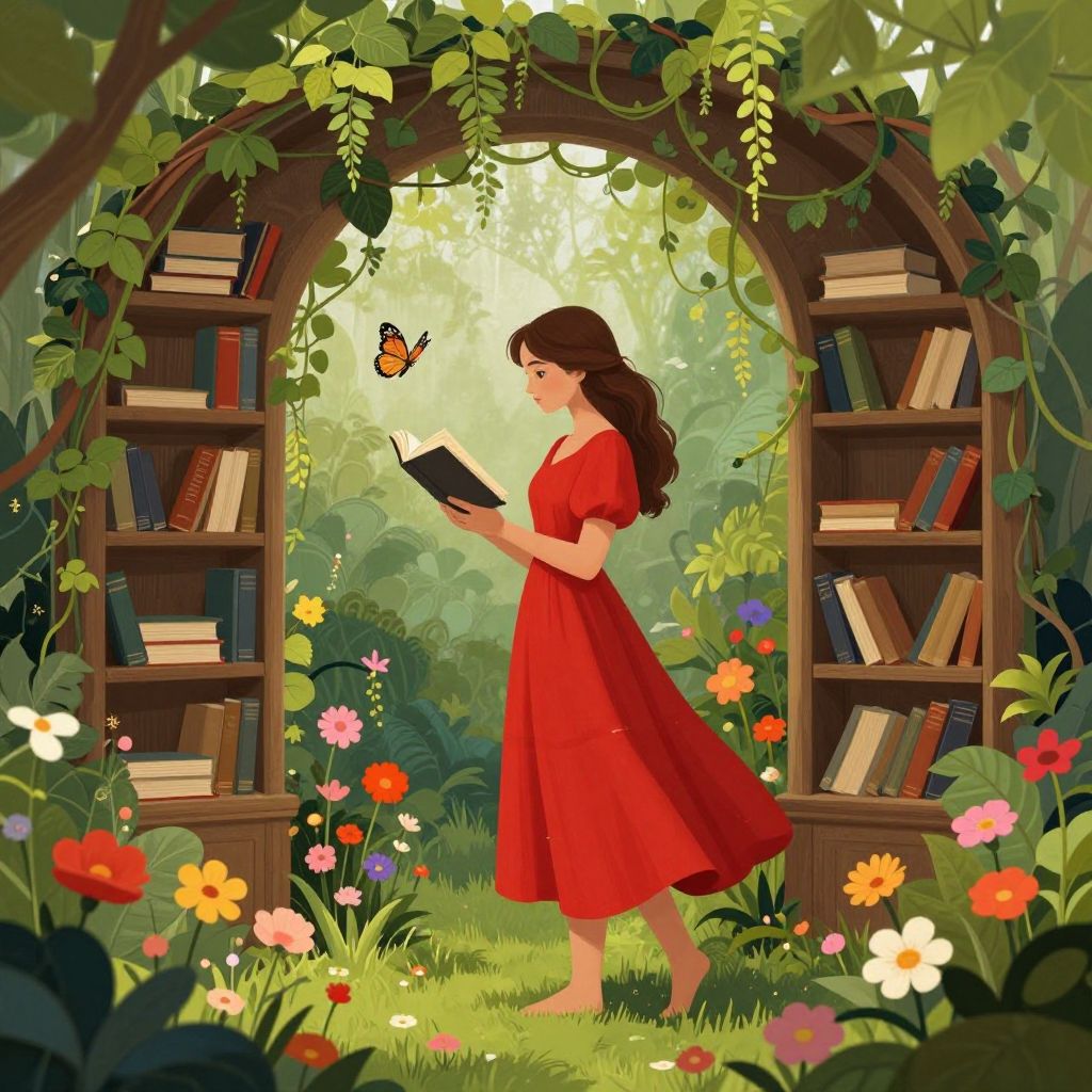In a serene, computer-generated illustration, a young woman in a flowing red dress stands barefoot amidst vibrant flowers, reading a book under the archway of a lush, vine-covered garden, where books line the shelves and a butterfly flutters near her, symbolizing the magical intersection of literature and nature.