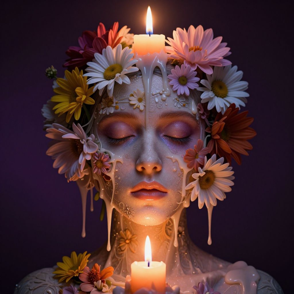 The image presents a surreal, hypermaximalist composition featuring an abstract woman's face made of flowers and melting candle wax. The face, with closed eyes and a serene expression, is adorned with a variety of flowers, including daisies and other blossoms, creating a delicate and intricate floral pattern. The wax, in shades of white and orange, appears to be melting, adding a dynamic and ethereal quality to the scene. Two lit candles, one at the top and one at the bottom, cast a warm, glowing light that enhances the dreamlike atmosphere. The background is dark, with a gradient that transitions from deep purple to black, further emphasizing the luminosity of the candles and the floral elements. The overall composition is balanced, with the face centrally positioned and the candles framing it, creating a sense of symmetry and harmony. The image is rich in detail, with a focus on textures such as the smooth petals of the flowers and the glossy surface of the wax. The lighting is soft yet dramatic, with the candles providing a focal point that draws the viewer's eye into the scene. The image is a stunning example of cinematic lighting and color grading, with a high contrast that highlights the intricate details and creates a visually striking effect.