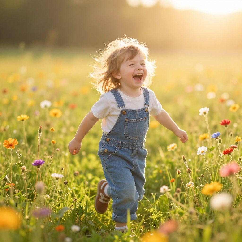Photograph of joyful blonde toddler in blue overalls and white shirt, laughing, running through vibrant sunlit meadow with colorful wildflowers.