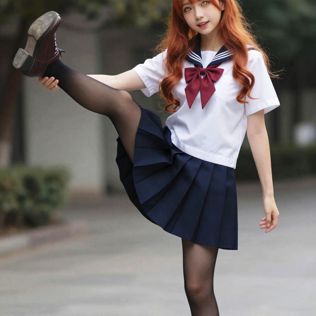 Standing_on_one_leg, leg_up Holding leg, best quality, high detailed, Faint lips, UC:realistic, cinematic lighting kawaii cute 1girl 16yo red hair amber eyes, pupils sparkling school_Uniform pantyhose ankle boots