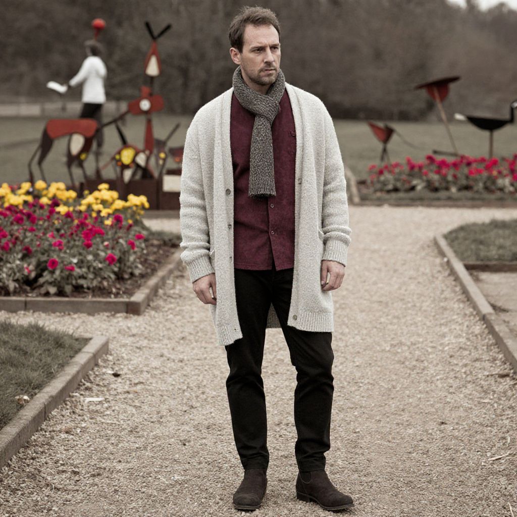 A man, light gray oversized cardigan, rich burgundy suede shirt, black tapered trousers, dark brown ankle boots, textured scarf, rustic gravel paths, vibrant flower beds, whimsical metal installations, sepia effect, contemplative expression. Man has masculine face and piercing eyes