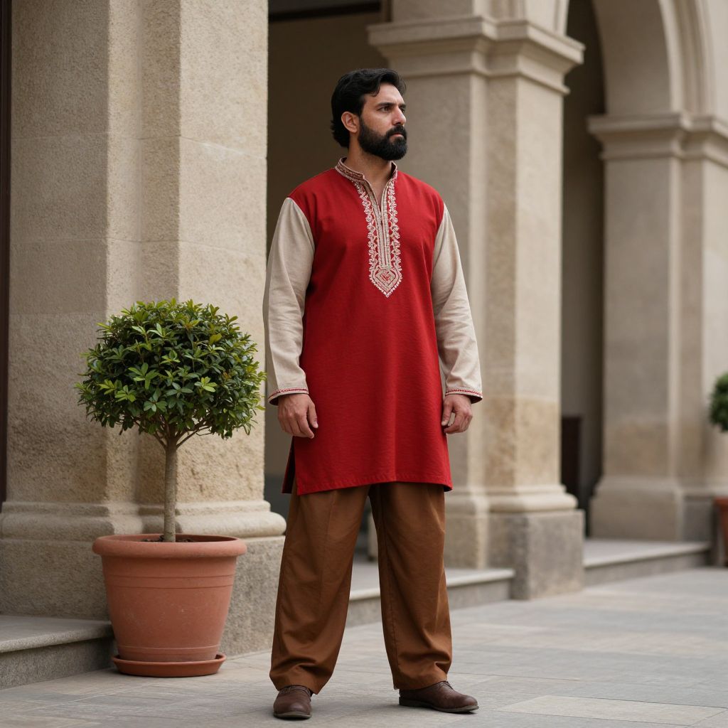 A man with dark hair and a beard wearing a red and beige outfit with a red embroidered shirt and brown pants. He is standing in front of a stone building with columns and a potted plant. The man has a strong, confident demeanor, with his eyes fixed on the horizon. The scene is set in a quiet, historic setting, emphasizing the contrast between the rugged man and the elegant architecture. The potted plant adds a touch of natural vitality to the otherwise stone-clad structure.