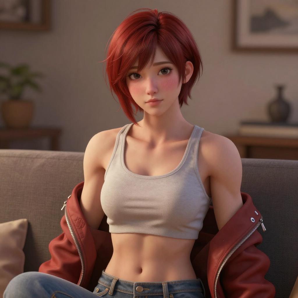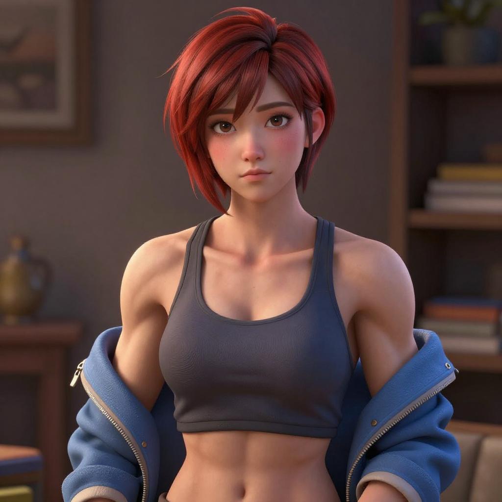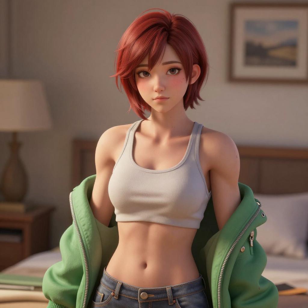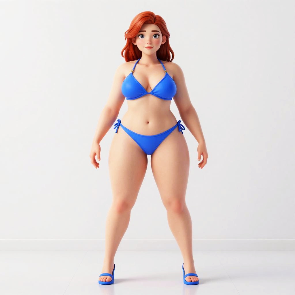 High detailed, masterpiece, 1girl cartoon character in a bikini and blue shoes, red hair, perfect hands, big breast, wide hips, thick thighs, ultra realistic digital art, a 3D render, photorealism, clean scene, white background, white wall, shinny floor, white floor