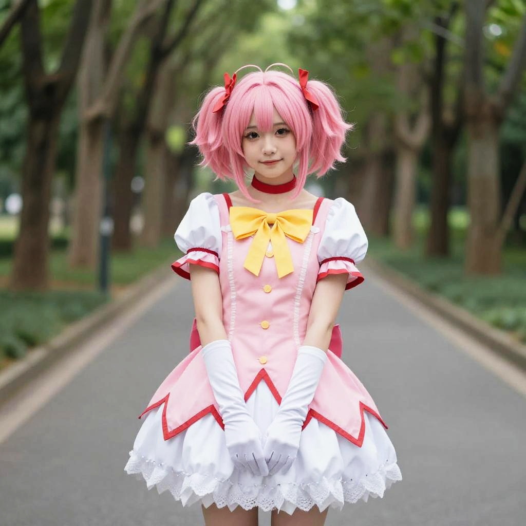 Photograph of a young woman with pink, pigtailed hair wearing a cute, anime-style pink and white dress with red accents and a yellow bow. She's standing on a tree-lined path, with her hands clasped in front, wearing white gloves and a red choker. The background is a blurred, green, forested area with a paved path. She's smiling softly at the camera.