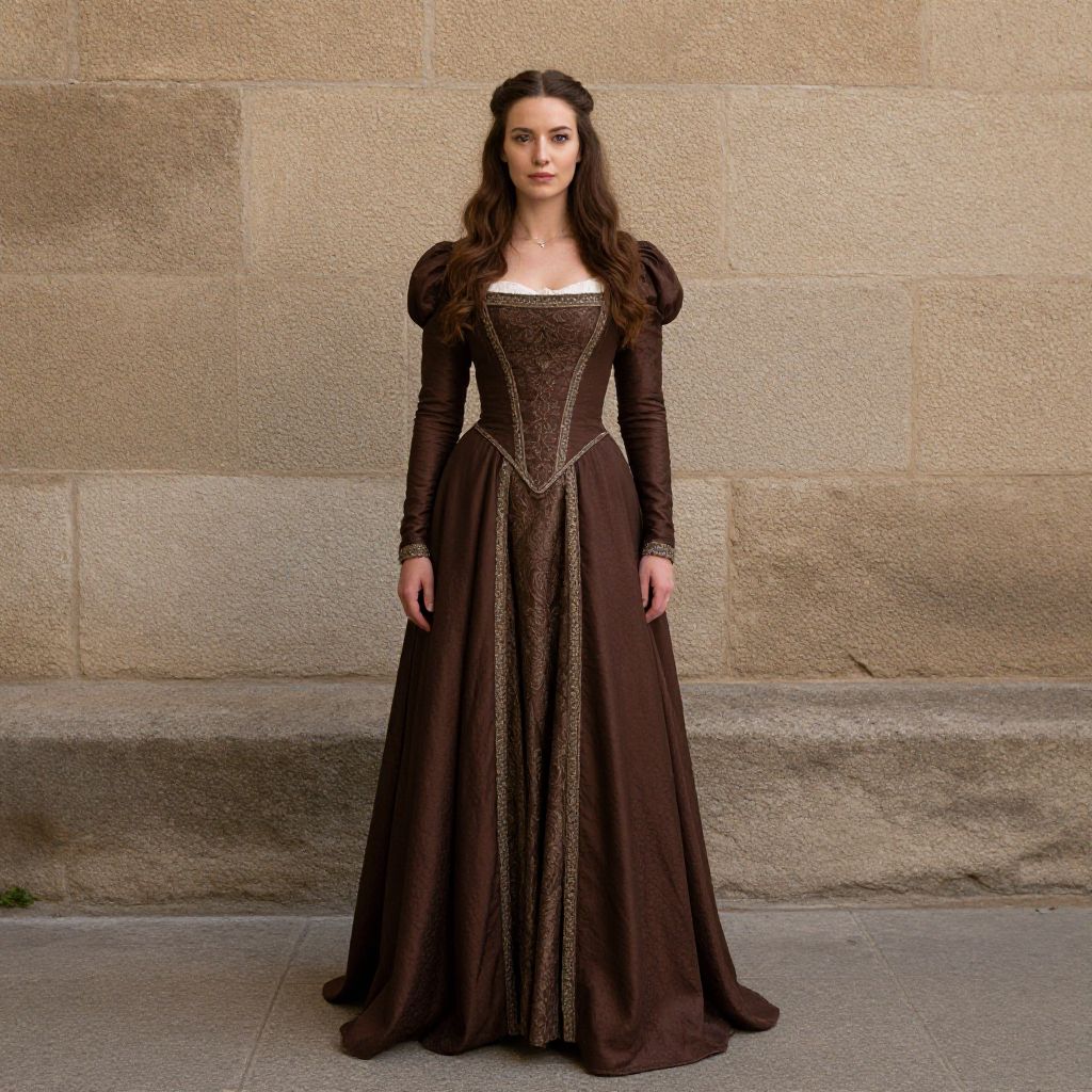 Photograph of a young woman with long, wavy dark brown hair, standing against a beige stone wall. She wears a full-length, dark brown Renaissance-style gown with puffed long sleeves, a fitted bodice with intricate embroidery, and a white square neckline. Her expression is neutral, and she stands with her arms relaxed by her sides. The stone wall behind her is textured with visible mortar lines, and she stands on a grey concrete pavement. The overall style and attire evoke a historical, regal appearance.