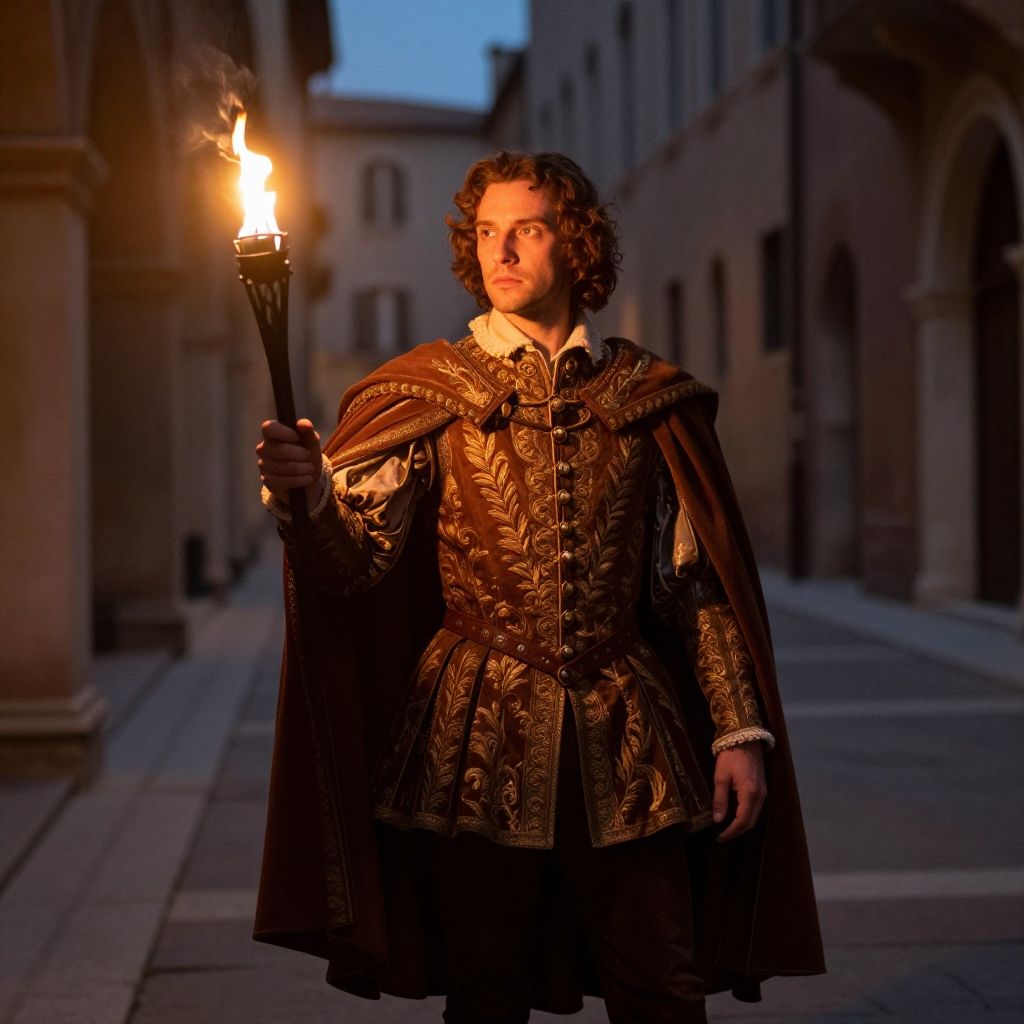 Paris in Romeo and Juliet, noble suitor clad in ornate doublet and cloak, standing amidst Verona’s ancient streets, illuminated by torchlight, capturing Renaissance romantic tension
