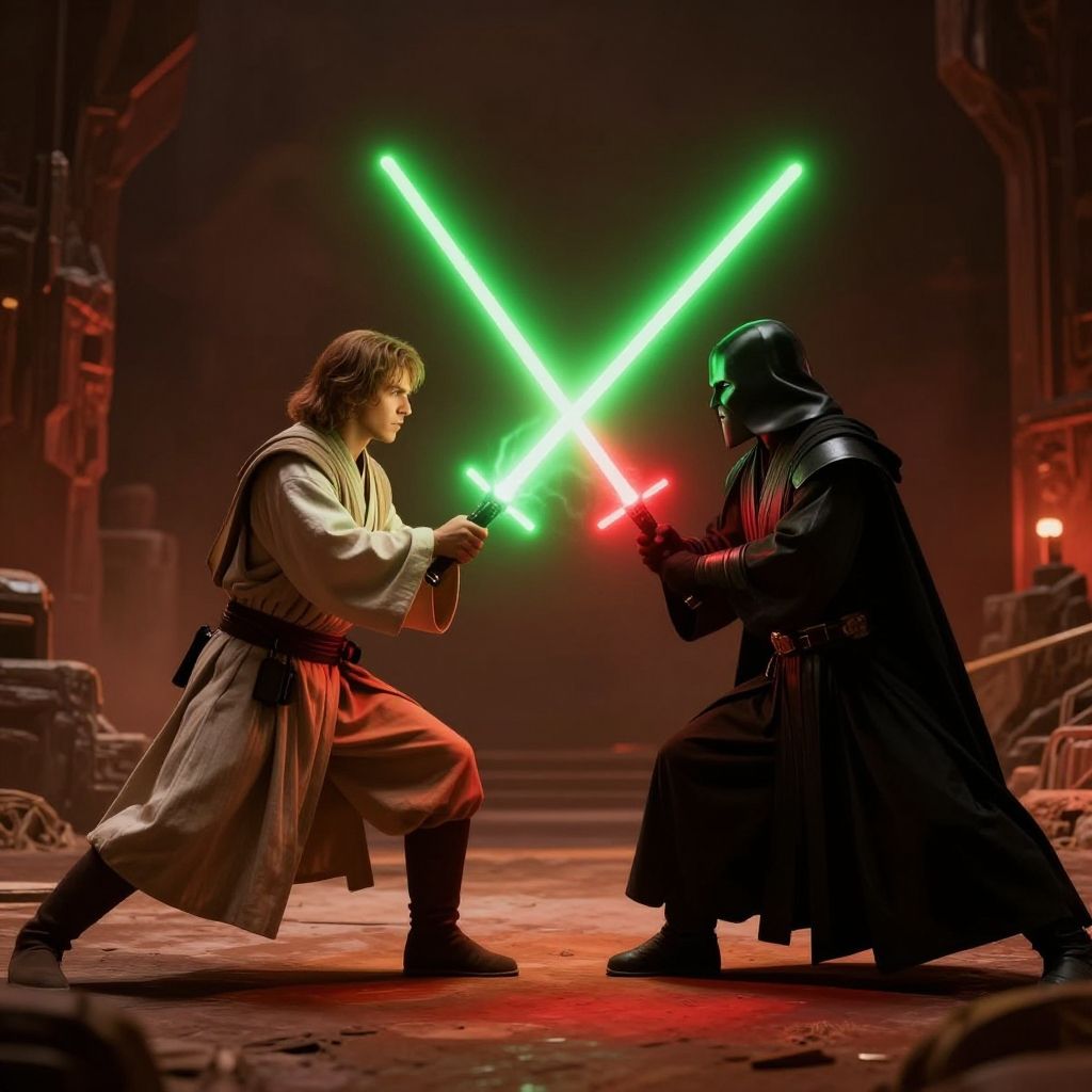 Astonishing scenery from Star Wars picturing 1 jedi and 1 sith fighting each other, face to face, green lightsaber, red lightsaber, ASCII Masterpiece, (cosy), (ultra high res, mj, best quality, highly detailed:1.5), (cinematic), (volumetric lighting, volumetric shadows:1.5), Amazing, (8k details), (photorealistic:1.4), warm lighting, ray tracing, dynamic lighting:1.5, details intricate, hyperrealistic photography, 8K