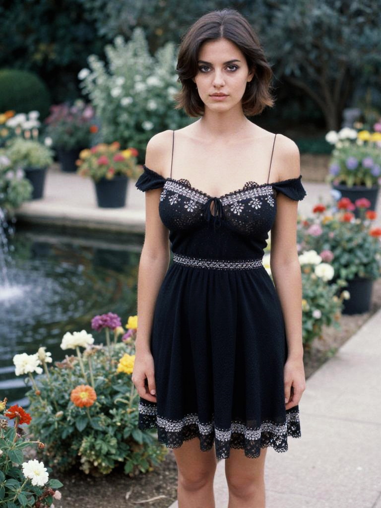 A Slim woman in a bohemian chic black sundress with lace detailing, off-the-shoulder neckline, and flared skirt, stands in a Flower garden beside a tranquil pond, captured in the style of Eastman reversal film stock. Sexy. Pretty face and beаutiful eyes. Big breasts