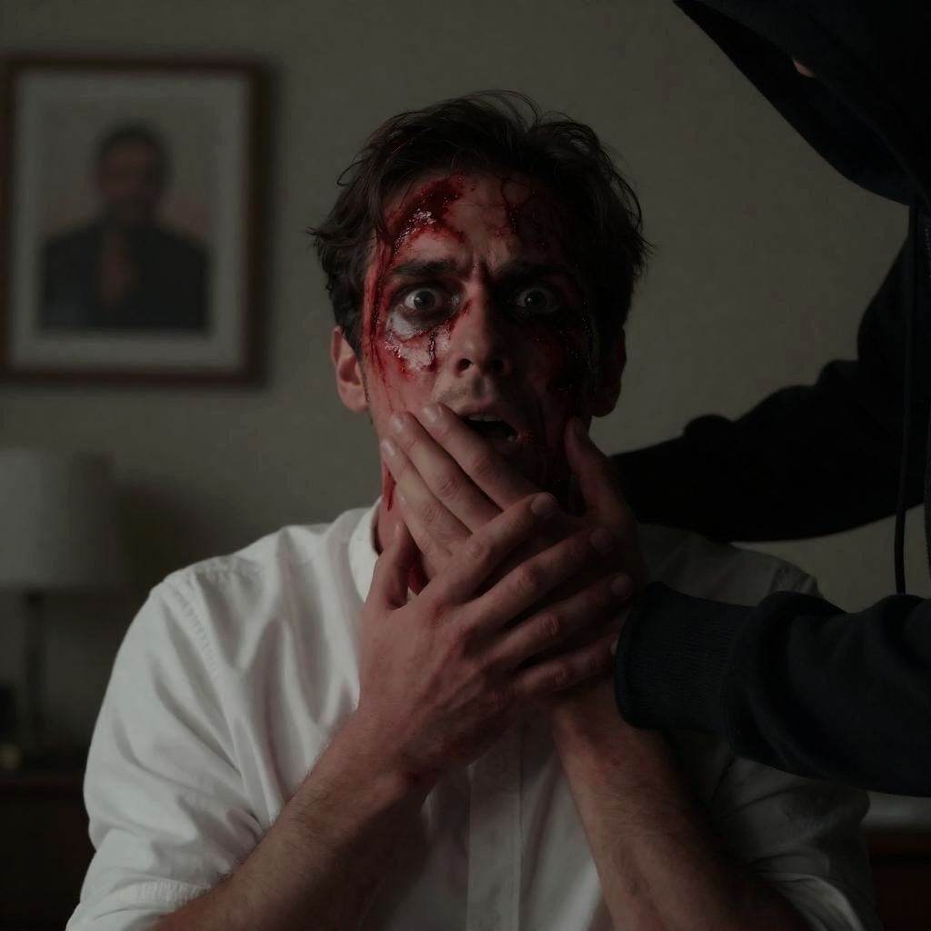 Man with bloody face, white shirt, wide-eyed, hands covering mouth, being choked by large gloved hand, dark hood, dimly lit room, framed picture on wall, lamp in background, intense expression.