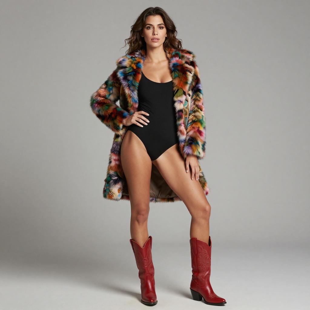 Photograph of a stylish woman with wavy brown hair, standing against a plain gray background. She's wearing a colorful floral fur coat, black high-cut swimsuit, and red cowboy boots. She's posing with one hand on her hip and the other resting on her thigh. The lighting is even, with no harsh shadows. The camera angle is straight-on, and the background is in focus. Depth of field is shallow, keeping the subject sharply detailed.