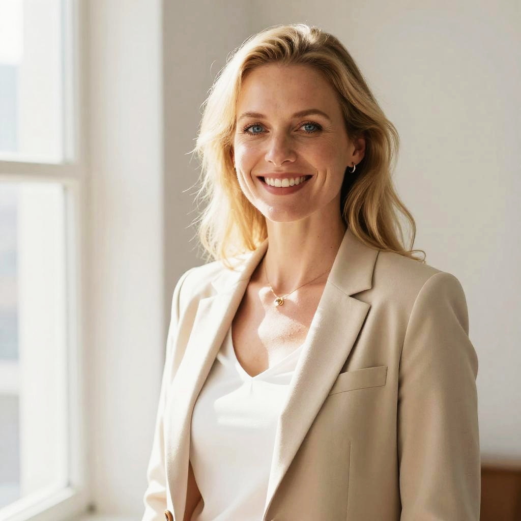 Photograph of a smiling blonde woman with light skin and blue eyes, standing in a sunlit room. She has wavy hair, wears a beige blazer over a white top, and stands in front of a bright window on the left. The background is a plain white wall, with soft natural light illuminating her face. She looks approachable and confident.