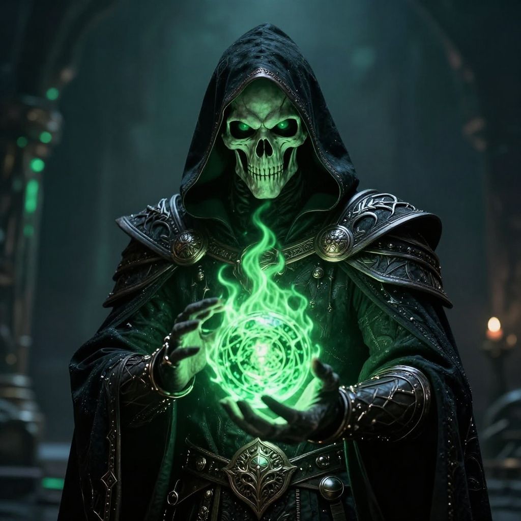 A dark sorcerer wearing an ornate hooded cloak and armor with intricate designs, holding a glowing magical orb emitting green flames. The figure has a skeletal face with eerie green eyes, standing in a mystical, dimly lit environment.