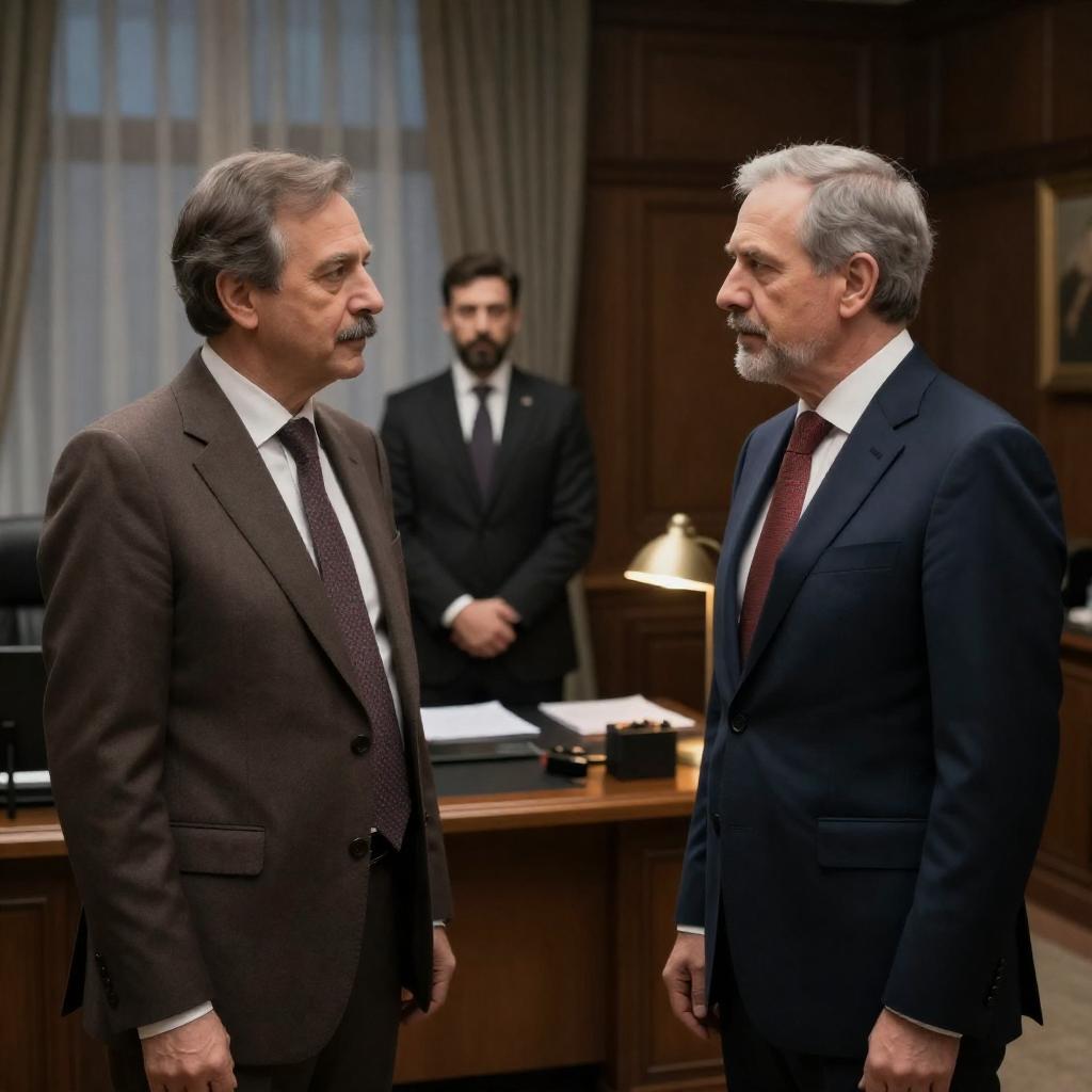 Photograph of an older man with gray hair, wearing a black suit, white shirt, and maroon tie, standing in a courtroom. Blurred crowd in background, people in formal attire. Man's expression is serious, slightly open mouth. Wooden courtroom setting.