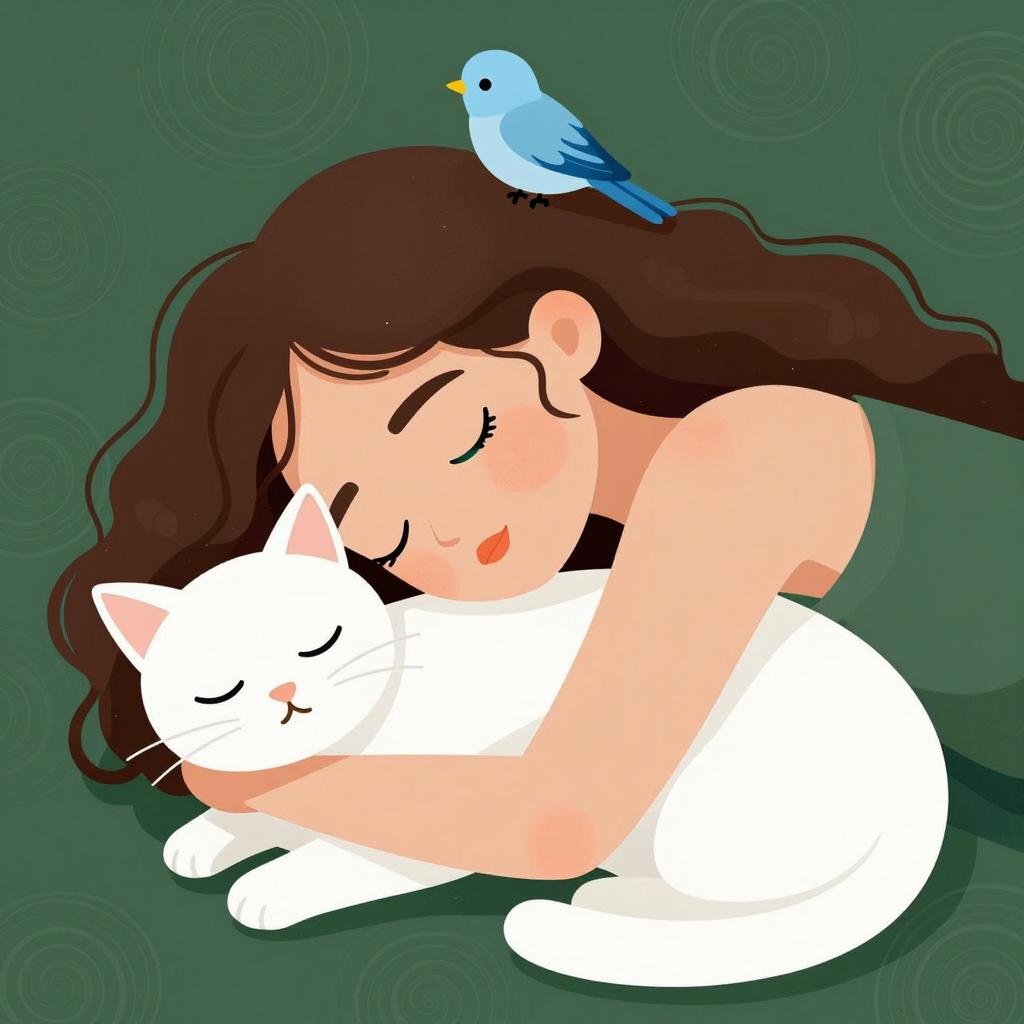 Illustration of a fair-skinned woman with closed eyes, curly brown hair, and green eyelids, sleeping with a white cat. A small blue bird is on her hair. Background is dark green with swirling patterns. Woman's head rests on cat's back. Cat's eyes are closed. Woman's lips are slightly parted. Cat's tail curves around.
