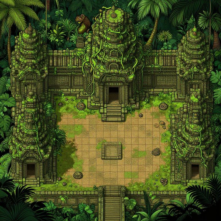 Tilemap of an ancient jungle temple ruins, overgrown vines, moss-covered stones, mysterious artifacts scattered around, jungle wildlife peeking through, earthy color palette, top-down view, hand-drawn texture style
