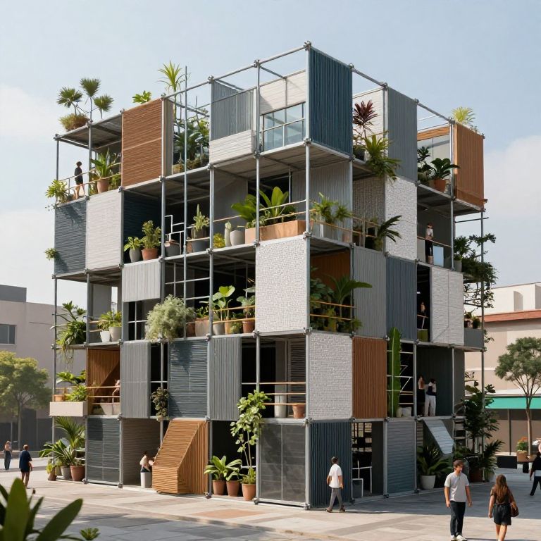 "Slick anarchist architecture made of modular blocks, has metal scaffolding, ultra realistic, plants, people standing on structure, sustainable materials,"