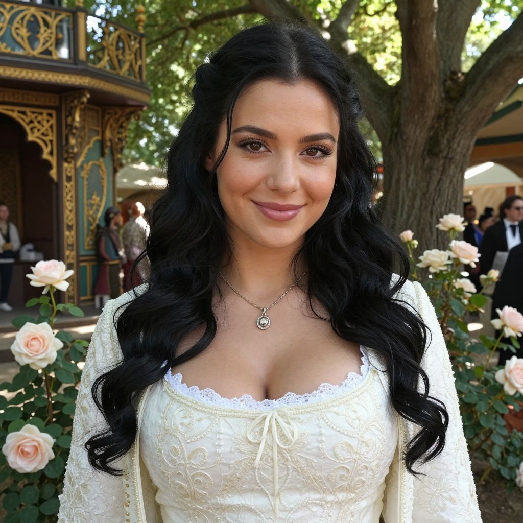 Close-up shot of a woman with long wavy black hair and a gentle smile wearing a detailed white gown costume, standing in a historical festival setting with blooming roses and ornate wooden architecture in the background, sunlight filtering through old trees. The woman has big tits and cute face