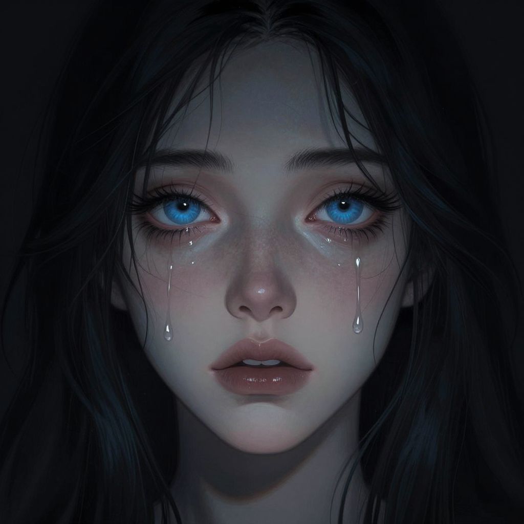 Digital painting of a pale, tearful young woman with striking blue eyes, wet black hair, and delicate features, set against a dark background.