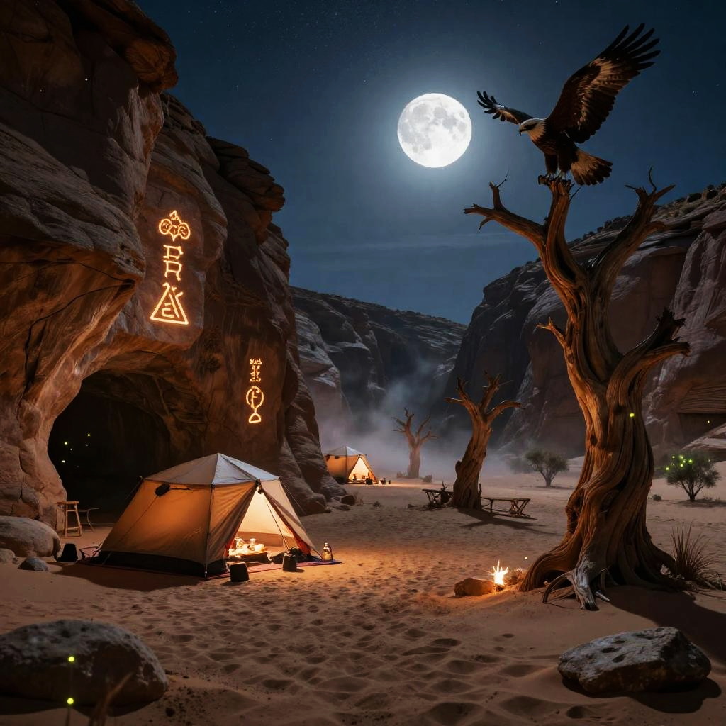 ASCII Masterpiece, (cosy), (ultra high res, mj, best quality, highly detailed:1.5), (cinematic), mythical nightscape in desert canyon with scattered petrified trees, featuring weather-beaten encampment by cave entrance, infused with wind-carried sand spirits, glowing fossilized glyphs, watchful hawk spirit, sky full of stars, wild camping ambience, (fireflies:1.5), intricate environmental details, volumetric moonlight, ambient mist, long exposure trails, subtle godrays, cinematic depth of field, soft bokeh, natural film grain, high dynamic range, hyperrealistic photography, 8K, night, full moon, masterful composition, unreal engine lighting