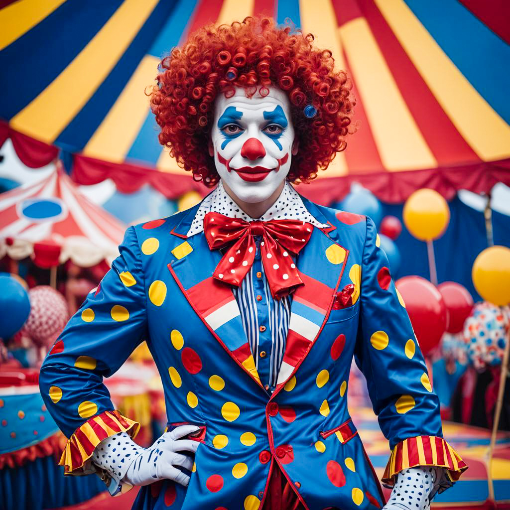 Portrait of a woman dressed as a vibrant clown with a curly red wig, white face paint with colorful polka dots, and a bright red nose. She wears a shiny blue clown jacket with red and yellow polka dots, a ruffled polka dot collar, and striped yellow and red knickers. The background features a brightly colored fairground tent and circus decorations in red, blue, and yellow.