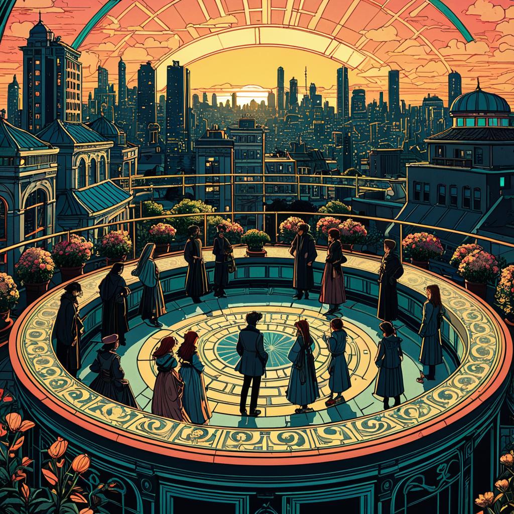 Illustration featuring twelve stylized zoetrope characters standing in a circular rooftop garden overlooking a dense cityscape at golden hour. The scene combines Art Nouveau curves and cyberpunk neon textures with influences from Pre-Raphaelite paintings and shoujo manga. The detailed digital artwork showcases fine inking lines, flat colors, and a warm sunset glow illuminating the city and rooftop architecture.