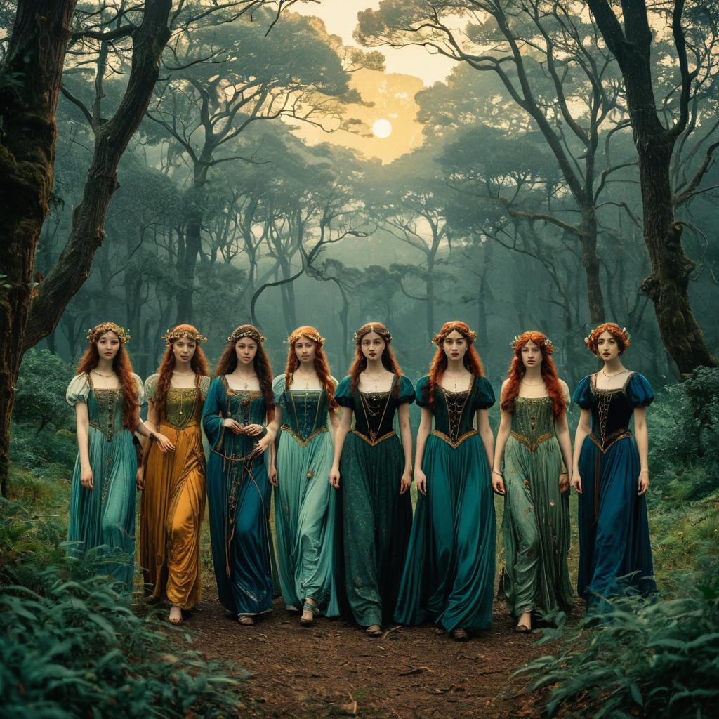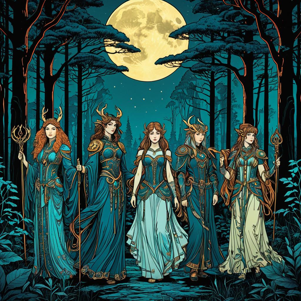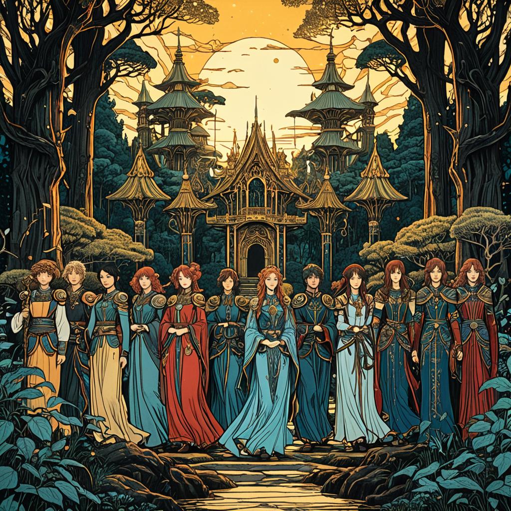 Depict twelve zoetrope characters in a rooftop garden cityscape at golden hour, merging Art Nouveau curves combined with cyberpunk neon textures, inspired by Pre-Raphaelite paintings and shoujo manga, with stunningly detailed fine inking lines, flat colors, 4k photorealistic.