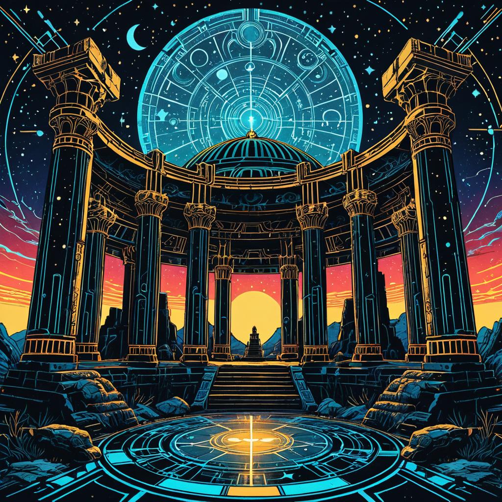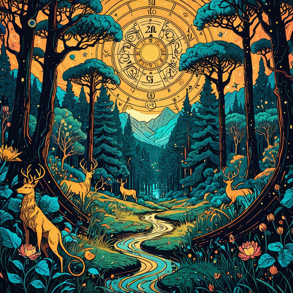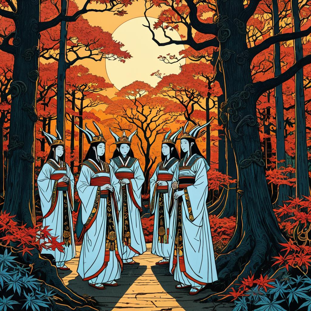 Depict twelve zoetrope characters in a rooftop garden cityscape at golden hour, merging Art Nouveau curves combined with cyberpunk neon textures, inspired by Pre-Raphaelite paintings and shoujo manga, with stunningly detailed fine inking lines, flat colors, 4k photorealistic.