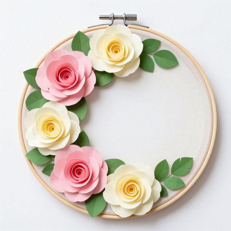 Circular wooden embroidery hoop adorned with three delicate paper roses—pink, cream, and pale yellow—interspersed with vibrant green leaves, creating a charming floral wreath ideal for nursery decor or photo props.