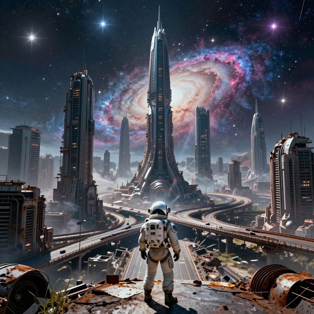 In the foreground lays the whimsical, decaying, moss-covered, and weathered metal body of a long-defunct robot, its rusted frame blending completely into the natural environment, Beside it, an old, half-rotted sign lies on the ground, bearing the faded TEXT:\"lil buzz pls\" hinting at its past use as a begging shield, The robot’s head, overgrown with vines, gives an eerie sense of abandonment and forgotten technology, Behind this rusted relic, a massive abyss hovers in the vastness of outer space, its colossal form seemingly bowing down to the viewer, Two towering structures, forged from black metal, rise ominously into the high clouds, Their sleek, modern-medieval design incorporates both sharp geometric angles and massive windows that reflect the fading light, A bridge of cold, gleaming metal connects the two towers, reinforcing their imposing presence in the sky, The hyper-realistic scene captures a tranquil, mist-shrouded landscape at twilight, with rolling hills and deep valleys bathed in soft orange light, The terrain is covered with delicate shrubs and grasses, their leaves tinged in deep black-pink hues, creating a striking contrast against the cool, misty atmosphere, The decaying robot’s weathered form, set against the towering black metal structures, evokes a haunting sense of the passage of time, where nature slowly reclaims the remnants of a long-lost civilization