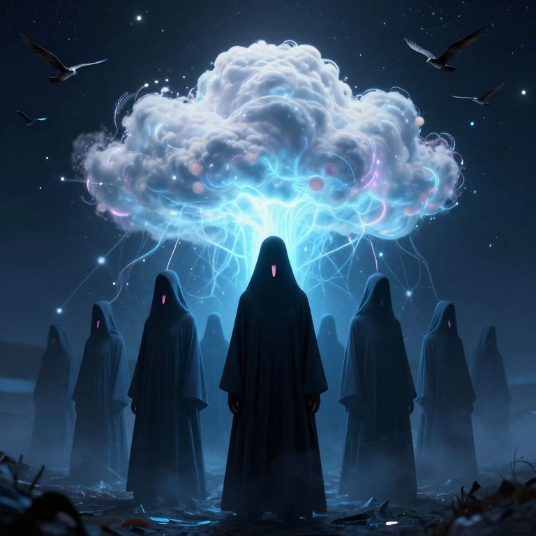 In a surreal, cyberpunk-inspired digital artwork, a group of cloaked figures stands before a bioluminescent cloud that glows with ethereal light, symbolizing the tribe's dream communication through their tongues, as birds soar against a starry night sky.